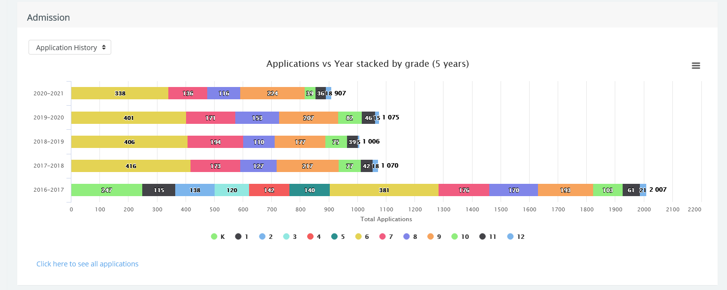 Administrators can see a chart of admissions for current and previous years under School→ School Overview This chart will help school leaders visually compare the last 5 years' application data and analyze current year's applications based on gender, ethnicity, grade, zip code, and confirmation status.
