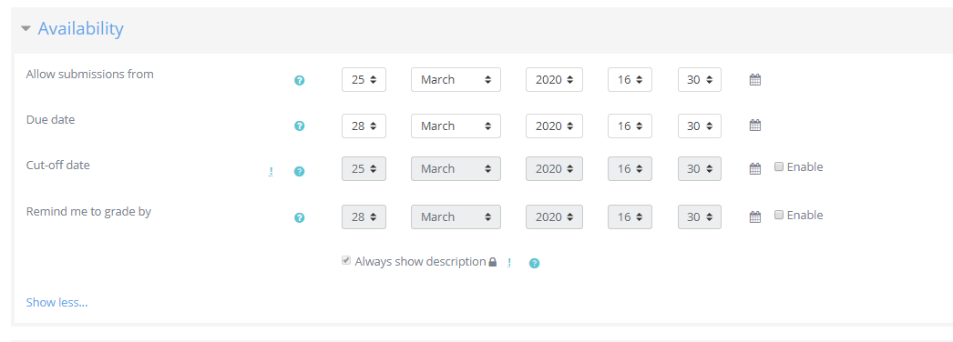is important since it determines when your students can start submitting their work and how much time do they have. In addition to the due date, you can specify a cut-off date which would extend the time for students to submit their work. Extensions can be given to students individually if needed.