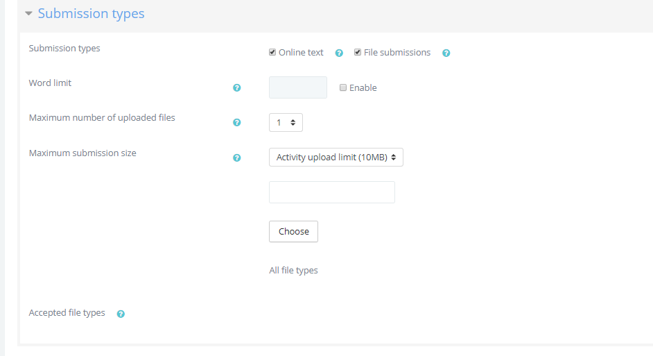 - Set File submission to Yes, and use Maximum number of uploaded files to set the maximum number of separate files they can upload