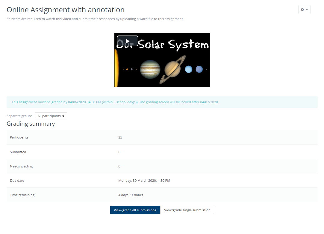 When done, click save and display to see the summary of the assignment you have created. On this page, you can see the number of participants, the number of students submitted and the number of submissions needs grading.