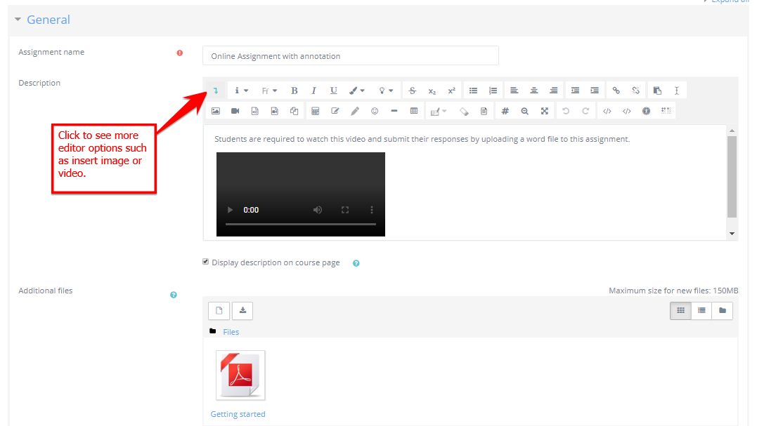 Additional files: Here you can add files that may be of help to the students as they do their assignments, such as, example submissions or answer templates.