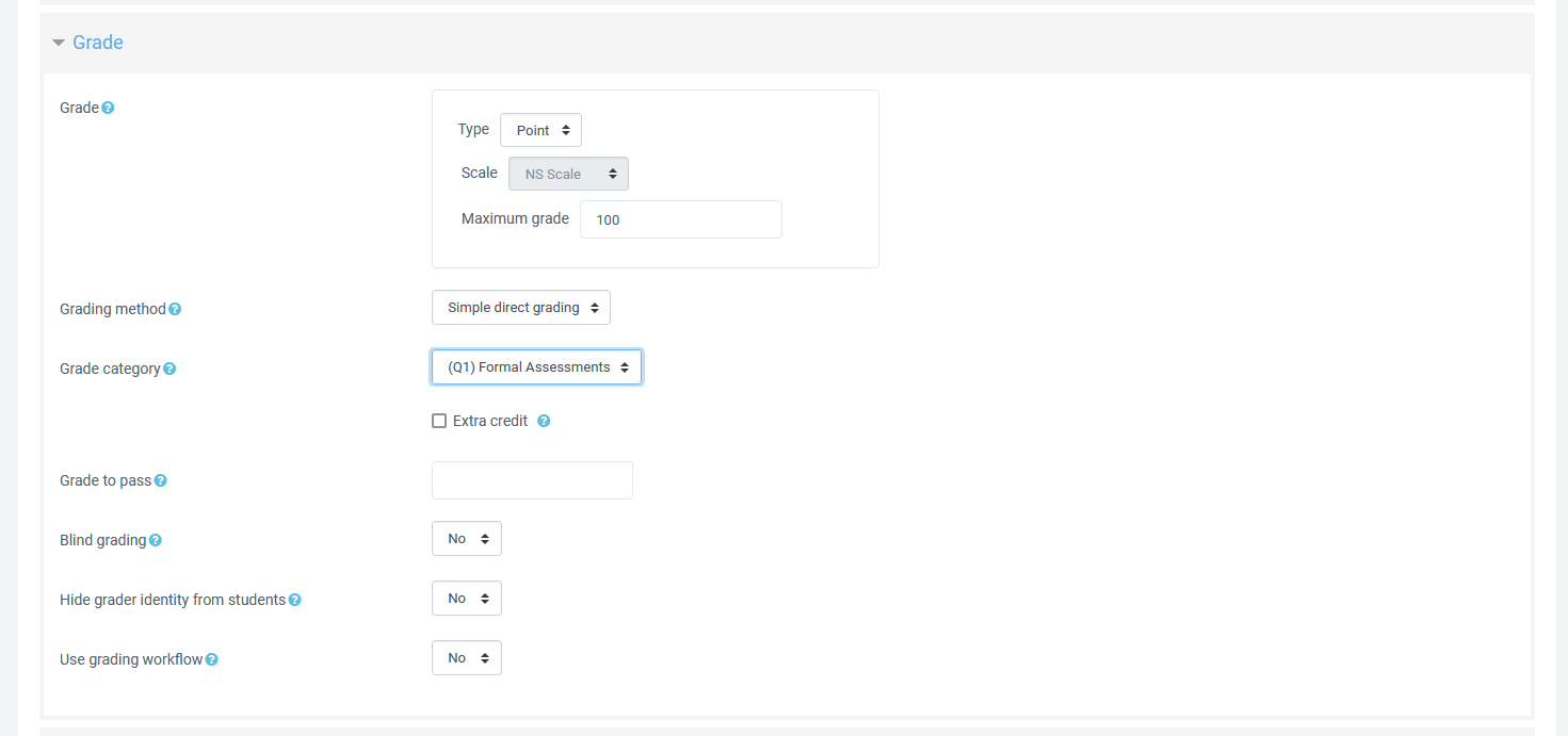 Remember to complete the grade settings by expanding the grade section. This is the most important section of the assignment settings. When grading an activity it is possible to use a grading scale, a grade point (numerical scale), or neither. Make sure to select the correct grade type for the assignment if it is not already pre-selected.