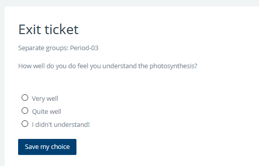 The Choice activity allows you to ask a question and set up radio buttons which learners can click to make a selection from a number of possible responses. They can choose one or more option and they can update their selection if you allow them. Choices can be useful as quick poll to stimulate thinking about a topic; to allow the class to vote on a direction for the course, or to gauge progress.