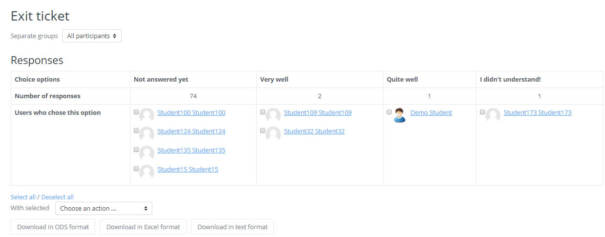 A teacher may download the results of a Choice activity by clicking the 'View... responses' link and then selecting from ODS, Excel or text format.