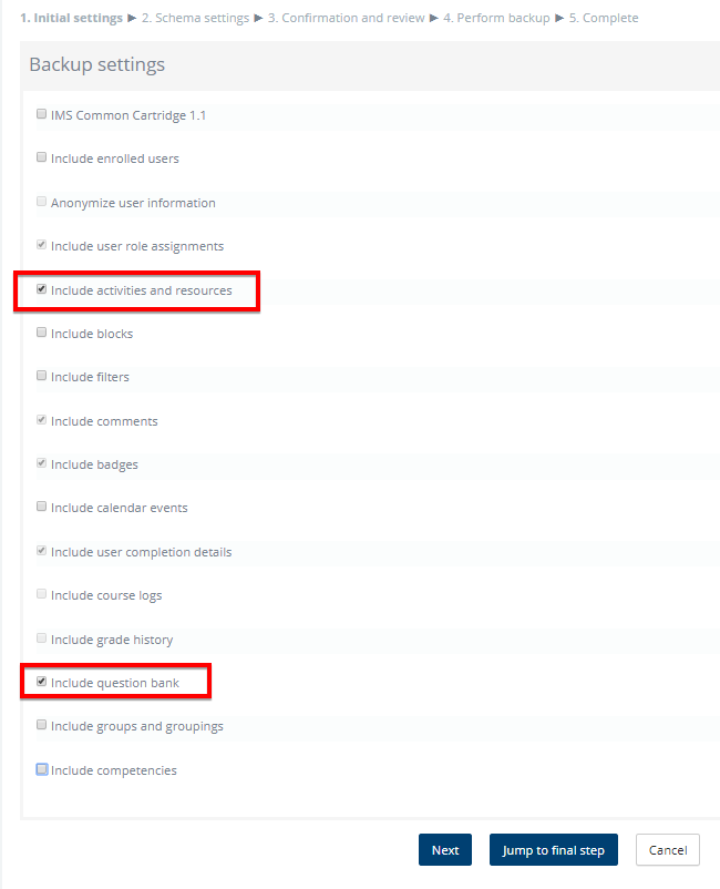 5. Settings - Select activities and question bank as available then click the Next button. Since the backup file did not include anything but "Activities" and "Question bank", the other options can not be selected. Anything other than those two should be unchecked.