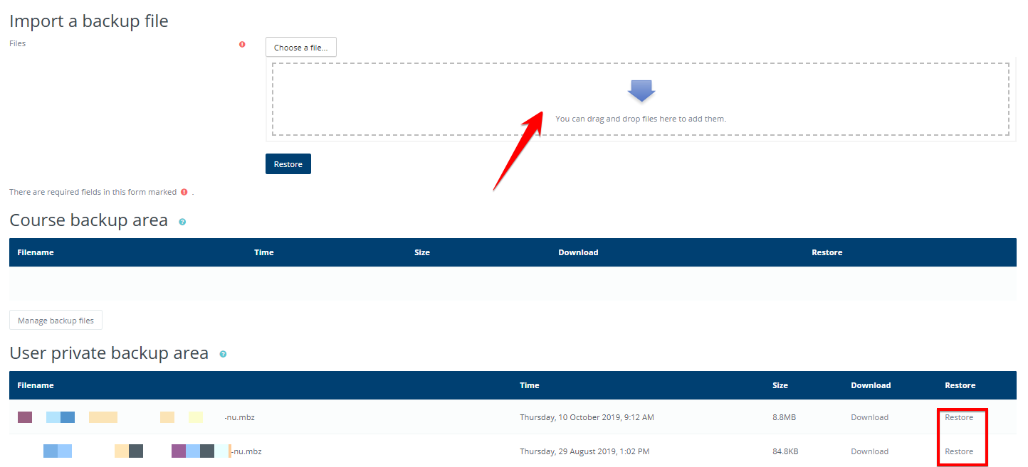 2. If you are restoring content from another site, upload your backup file (.mbz) and click restore. If you are restoring content that you backed up in the same site, find the file in your private backup area and click on Restore link next to it.
