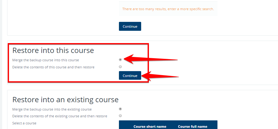 4. Destination - On this page, there are three "continue" buttons and they all have different destinations as a new course, this course, or an existing course. Depending on where you want to restore the file, you will click on one of them. In this example, we are restoring a single or multiple SBA activities into this course by merging the backup course into the existing one. Since we are already in the course we want to restore the content, scroll down and find the section that says "Restore into this course". If you are an administrator, you might see all the courses on the site and have to search/find the one you are looking for.