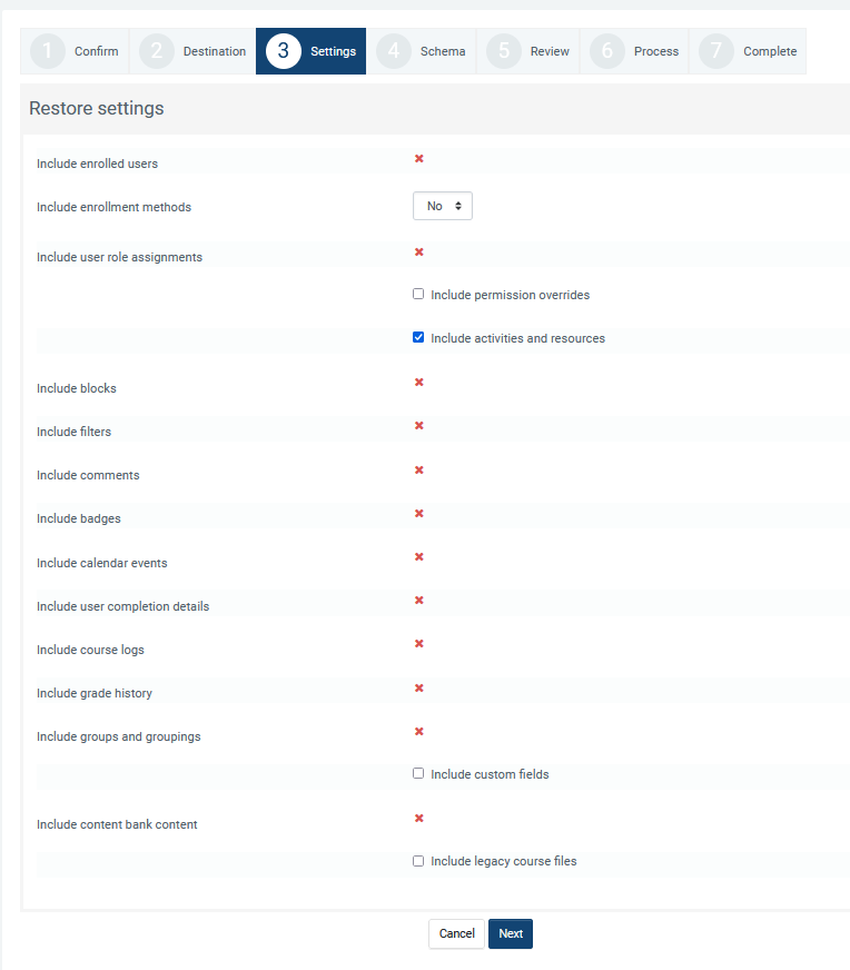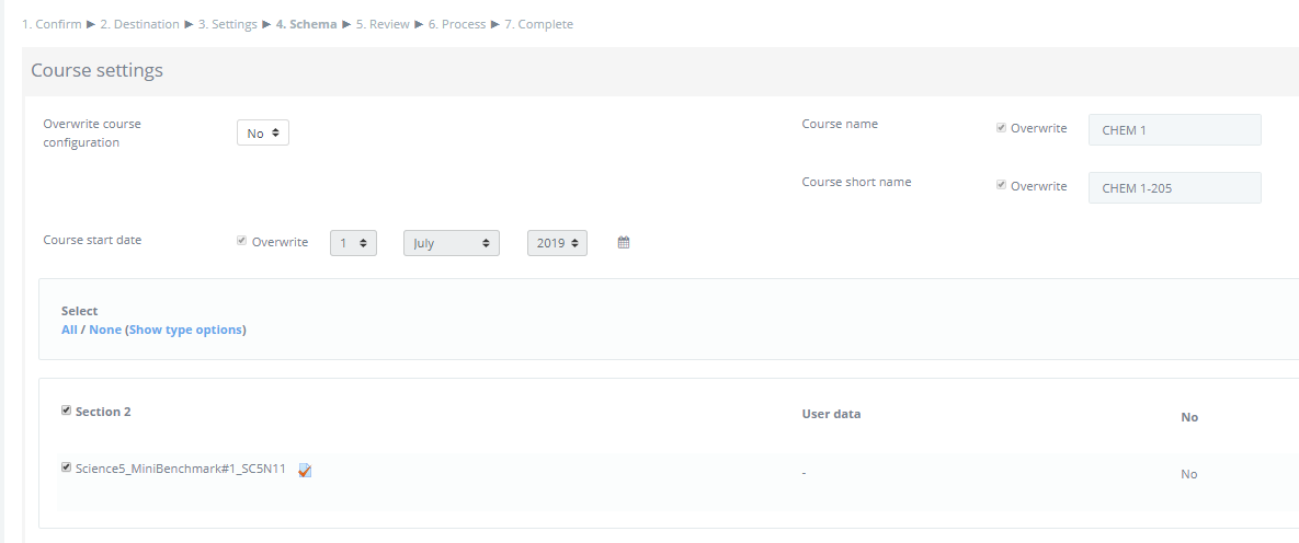6. Schema - Select/deselect specific items. Although it is possible to amend the course name, short name, and start date, do not change any of those since our goal is to restore activities to an existing course.