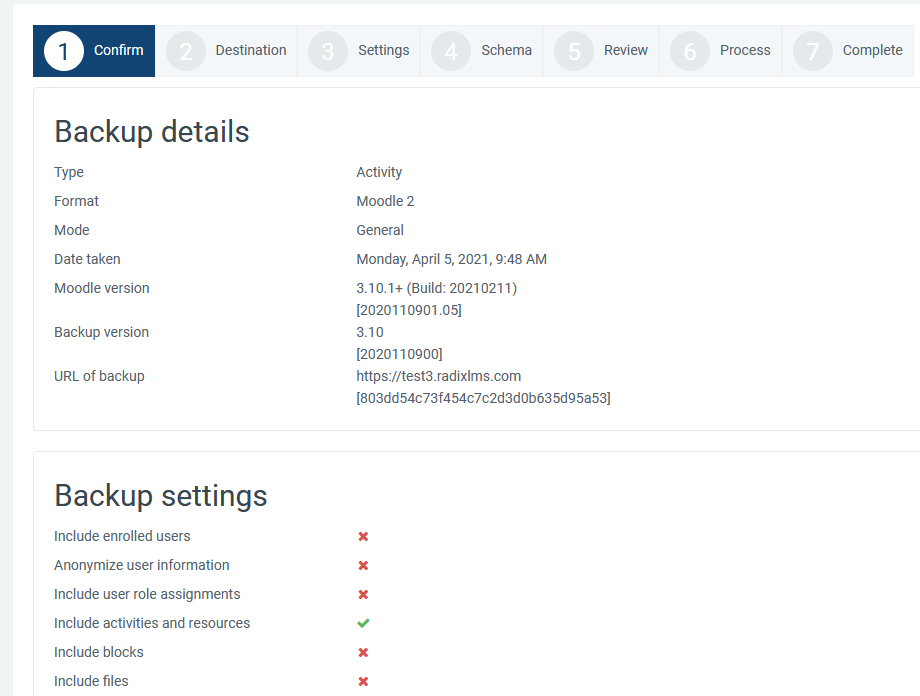 Depending on the number of questions in your question bank, the backup process may take longer than usual. To avoid that, try creating SBAs using the questions located in the course category. A backup file (with distinctive .mbz extension to avoid confusion with .zip files) is then saved in the course backup area. Backup file names are ending in -nu.mbz when backed up with no users. You can download your backup file to restore it to another Radix LMS site. If you are restoring the activities into another course on the same site, you can click on the "restore" button to start the process.