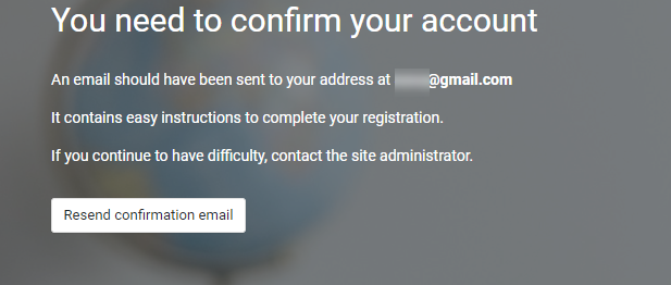 Go to the login page of your site and try to log in with the email and password you used to create your account. If the account was successfully created, you should see a message like the one below on the login page. Please click on the "resend confirmation email" button to have the system send another confirmation message.