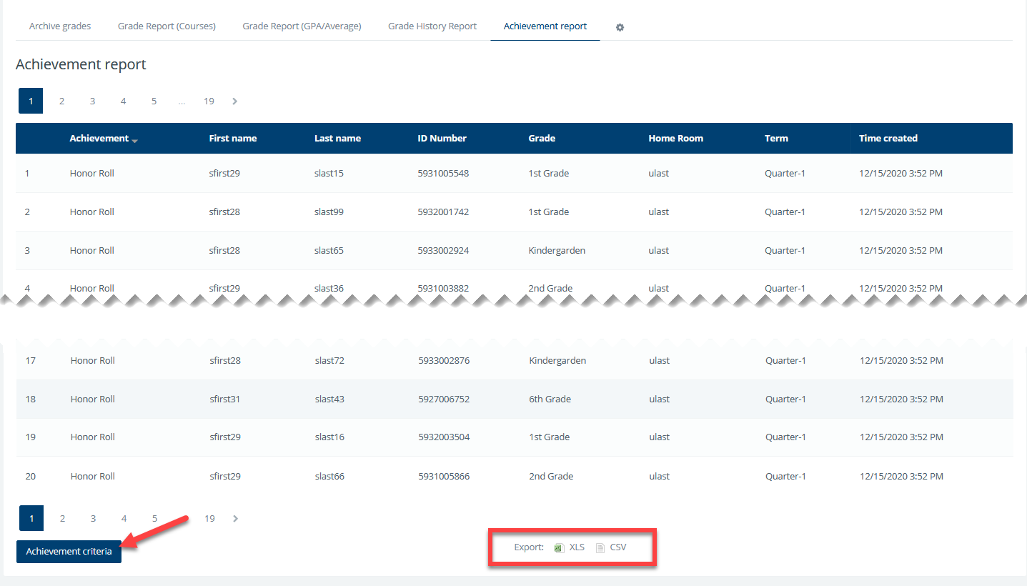 ![]() The achievement report with the names, ID numbers, grade levels, homeroom and term information of students. |