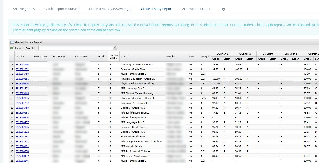 Grade History Report: This report shows the grade history of students from previous years as well as the current year. You can also download the individual PDF report of a student's grades by clicking on the student ID number. Current year's students' grade history pdf can also be accessed via the student list on School>User>Student page by clicking on the printer icon at the end of each row.