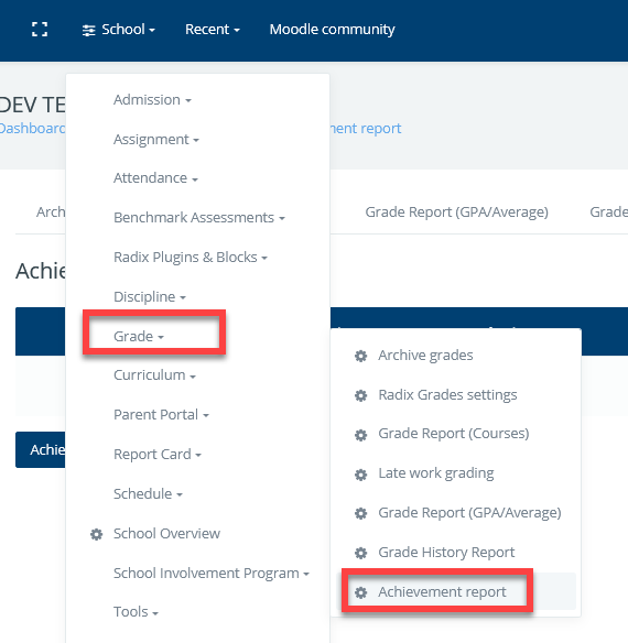Administrators can access school-wide grade reports via the Radix Grade menu and change the grade thresholds for the dashboards, notifications and reports.