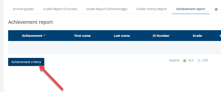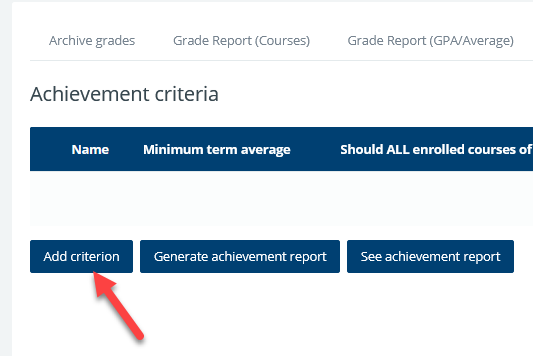 ![]() 1- Go to achievement report under "grade" | ![]() 2- Click on "Achievement criteria to see or add/edit them. This screen is where your report will appear once it is generated. | ![]() 3- Click "Add criterion" if this is the first time you are adding them. If you already added them, this is the page where they will be listed. |