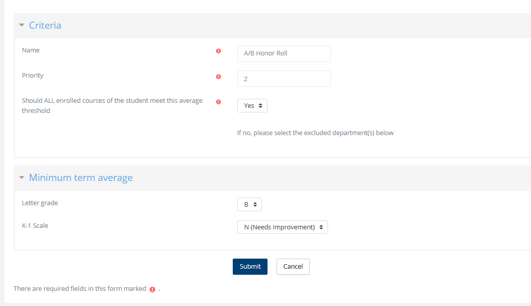 On the next page, you will add the details of your criterion for an achievement such as honor roll. Once done, add your next criterion such as A/B Honor Roll.