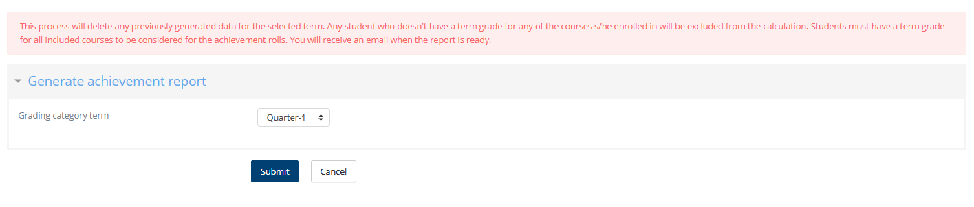 ![]() To generate your report, select the term and click submit. You can re-generate the report which will erase the previous data for the selected term. |