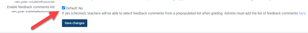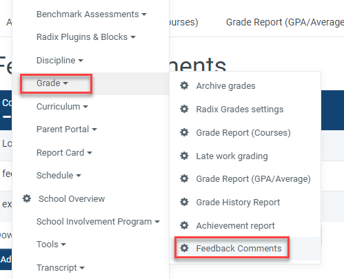 You can create a list of feedback comments that could be used by teachers to select when giving comments on the grading screens. To turn this feature on for the entire school, navigate to School > Grade > Radix grade settings and check the box next to "Enable feedback comments list" setting.