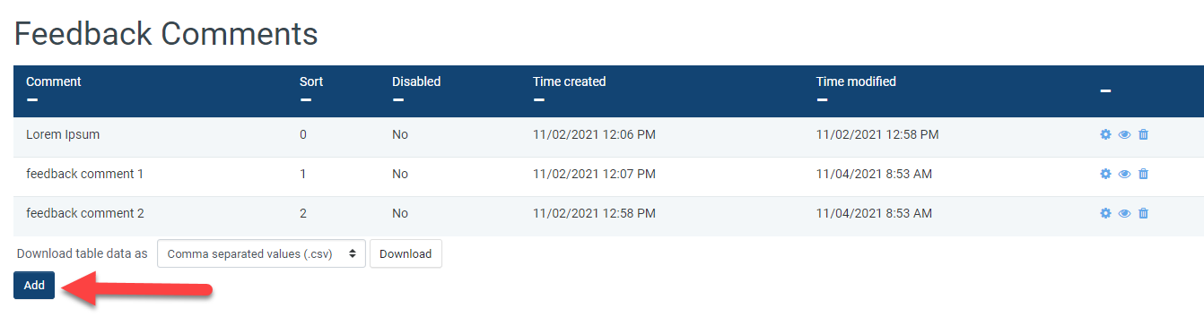 Click on add button to add new comments to the list or use the gear icon at the end of the row to edit one. You can also click on the eye icon to hide a comment from the list. A comment that has already been used by the teachers will not be affected by changing, deleting, or hiding it.