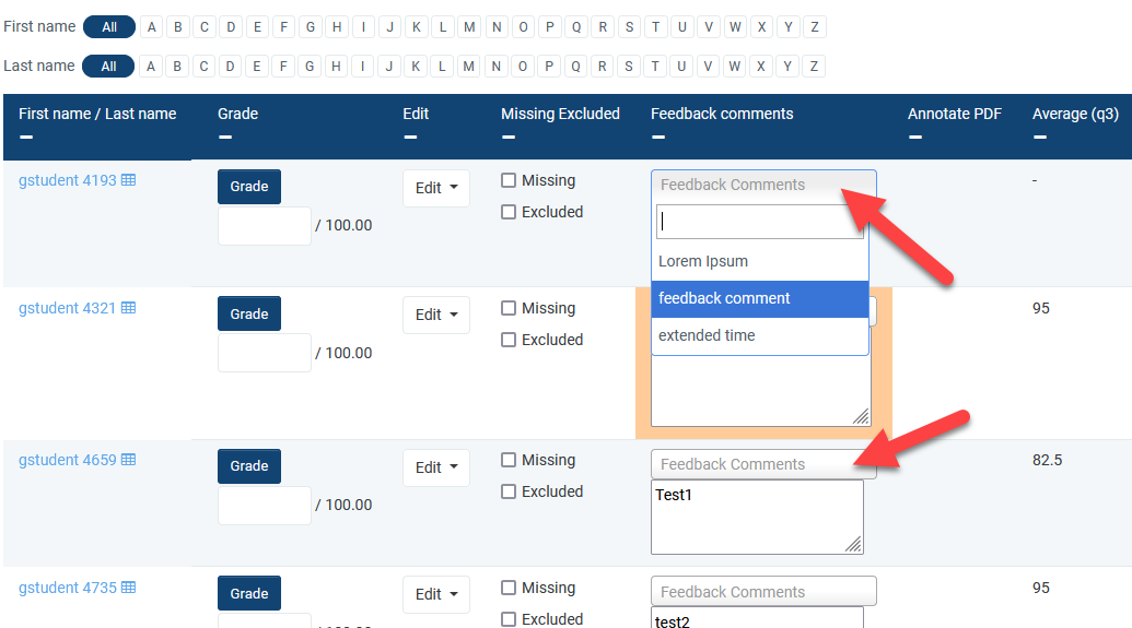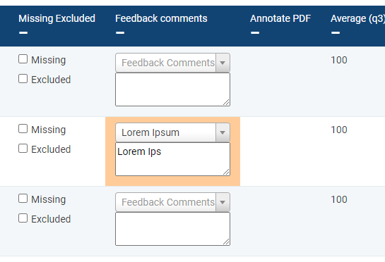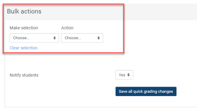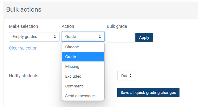 This section gives the ability to do bulk actions on the quick grading page. Bulk actions that can be performed are entering grade, marking missing/excluded, un-marking missing/excluded, entering feedback comments, and sending a message.