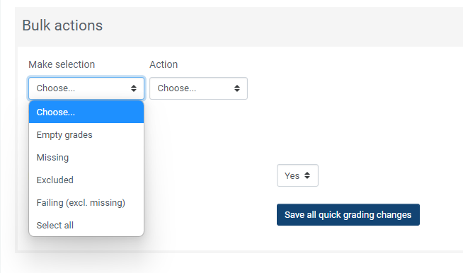 Step 2- Choose your action under the "Action" drop-down menu. The actions you can choose varies based on the selection you made. For instance, you will only see "unmark missing" if you selected "missing" grades on step 1.