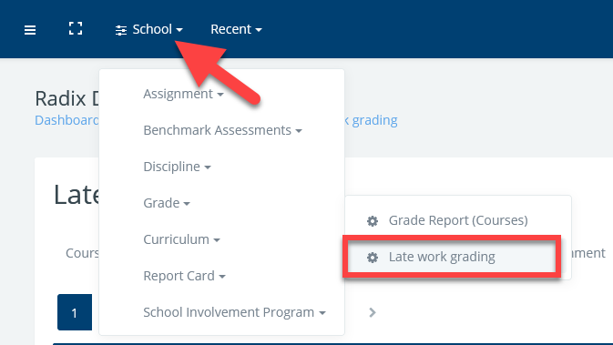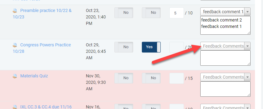 Please note that if your school uses assignment grading restrictions, it will apply on this page as well. If the grading due date has passed for an assignment, it will be highlighted in red and changes will not be allowed. See screenshot below: