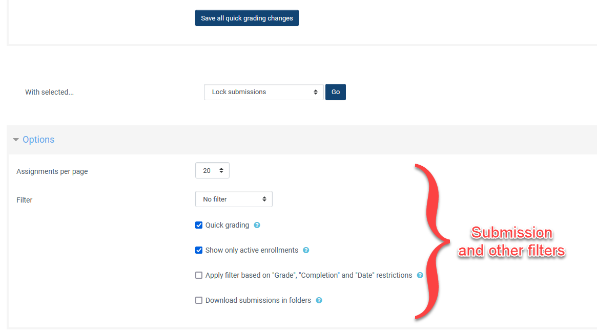 To access the Quick Grading interface, from the course page while the editing is turned on, click on the edit button of the assignment you are grading and click "grade" OR from the Grading Summary page click 'View/grade all assignments'; the Grading Table displays. Scroll to the bottom of the page to configure Options, and check the box for 'Quick grading'. While you're down there, you can also set the number of assignments to display per page, filter the assignments e.g. to see who has not submitted, unmarked assignments, etc.