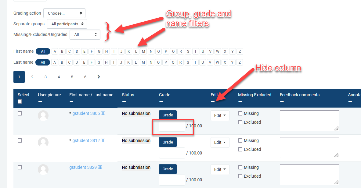 Quick grading lets you enter grades and feedback for multiple students directly on the View/grade submissions page.