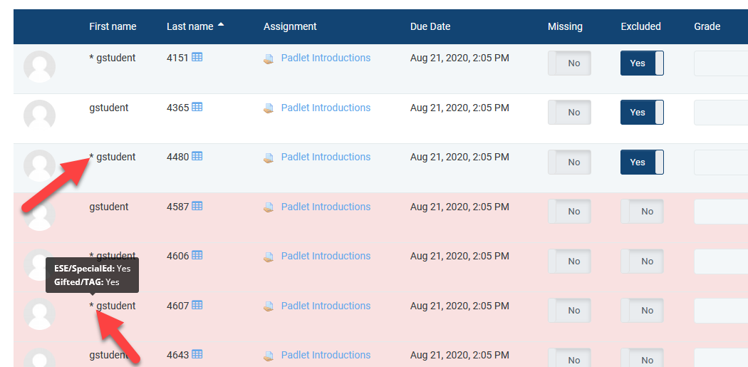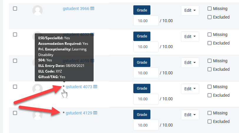 While you are on quick grading or late work grading screens, you will be able to see if the student is in any of the special programs such as ESE/Special Education, ESOL/ELL, Gifted/TAG, or 504. If the student is in any of these programs, an (*) will be shown in front of his name. Hovering your mouse over this asterisk will show the details of those programs.