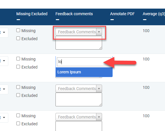 8. Once the feedback comments list is turned on and comments have been added by the admins, the teachers will see a dropdown list of comments right above the feedback comments text box on their grading page. Comments can be searched in the dropdown list as you type. When you select a comment, it will be inserted into the comment box and can be edited if needed.