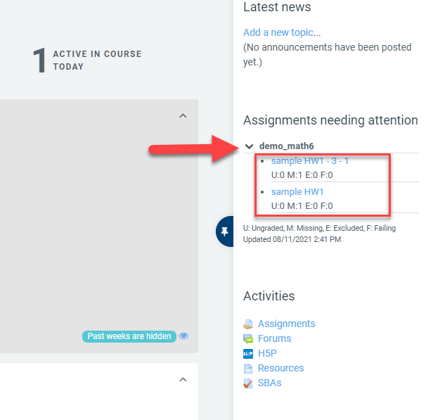 You can also access the quick grading screen of any assignment that needs your attention meaning, an assignment that has missing, excluded, failing, or empty grade. This block will show all of those assignments and clicking on the name of the assignment will take you to the quick grading screen. Please note that this list is updated nightly, so each morning you will see the most updated list on the block. To see the list, click on the small arrow in the block and expand the view.