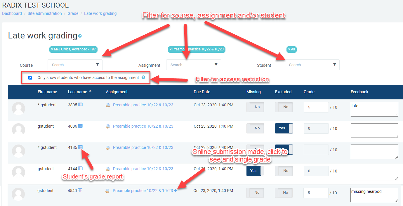 To filter the students based on the access restriction of the assignment you select, check the box next to the  Just check the box next to the "only show students who have access to the assignment" option.