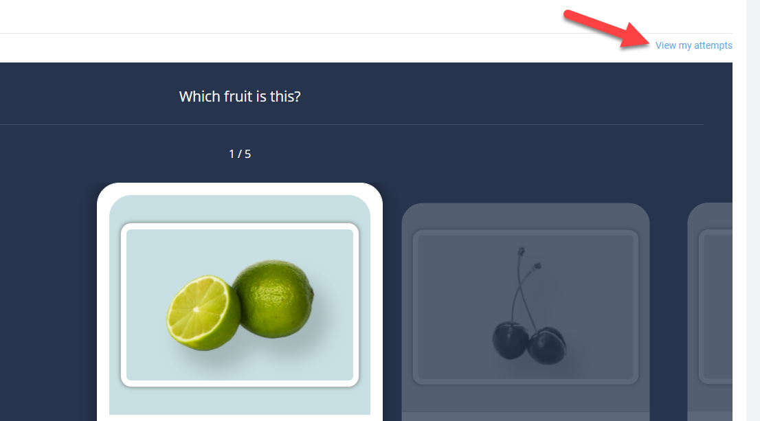 Depending on the H5P activity and teacher's settings, the activity may be gradable. Students can see their attempts from the View my attempts link top right.