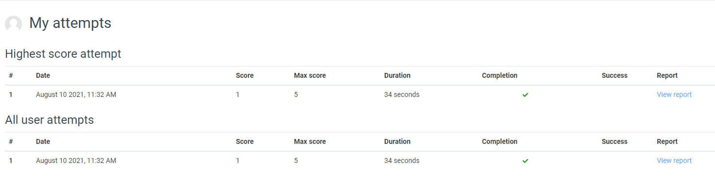 In the attempts report, the success column reports when the student has obtained 100% in the activity. The completion column reports whether the student went through the H5P content to the end. (The attempts report only displays data from the H5P content - there is no connection with the 'Grade to pass' activity setting nor with activity completion settings.)