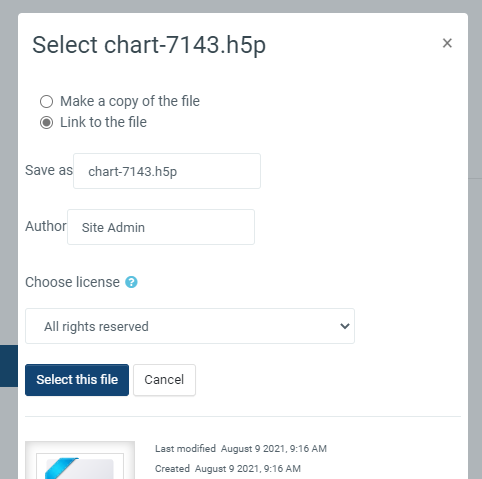 4. From Package file > File picker, add your H5P file from the Upload a file link or from the Content bank. Note: If you add the content as an alias, any modifications will be displayed here but if you add it as a copy, the modified version will not display. For more information see Working with files