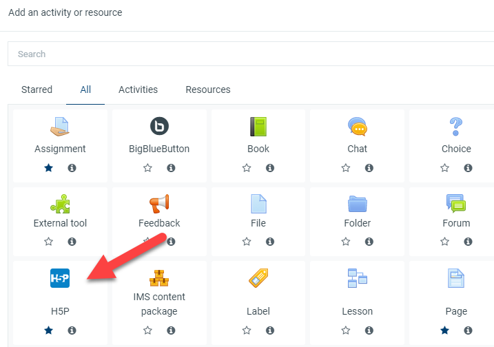 - In a course, with the editing turned on, choose 'H5P' from the activity chooser.