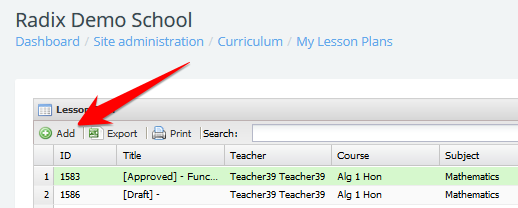 To add a new lesson plan, click on "Add" button on top left corner of the my lesson plan list or "Add Lesson Plan" link under curriculum.