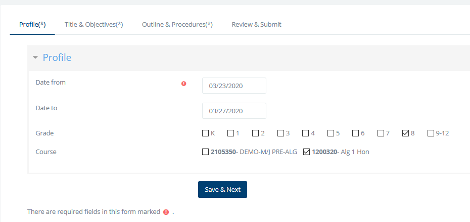 At this step, you will select the date from-to, grade level(s) this plan applies to and the course(s) this plan belongs to. It is important to make the correct selection at this step since the information that will be populated in the following steps will be based on the grade level and courses selected. All courses must be in the course directory with an official course code to be able create a lesson plan for them. If you receive a message saying otherwise, please contact your school admin.
