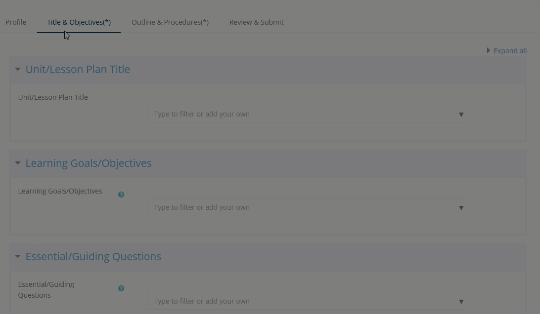 Most of the sections have a search ready drop down list which consists of previously entered information for the selected courses. All new data saved for a course will be available to teachers to use after the LP is approved by admin.