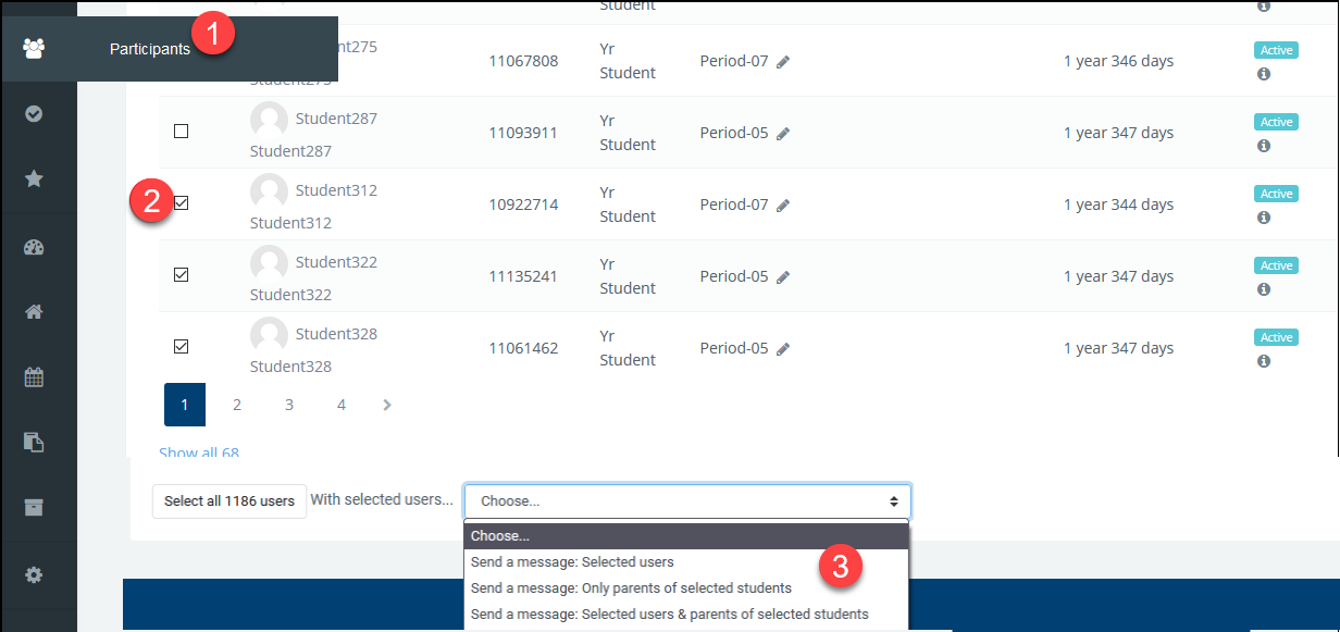 Choose "Send message" from the "With selected users..." drop-down menu. You have the option to send messages to only selected students, only parents of selected students, or both. Or you can select filter a specific role(s) to send your messages.