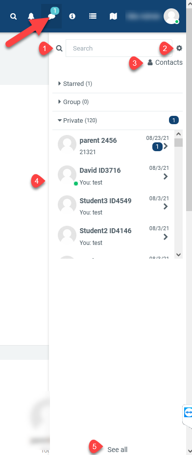 Clicking there displays the new messages, along with the option to send a new message on the sidebar. (1) search messages or contacts, (2) change your messaging preferences, (3) see your contact list (4) messages sent/received (5) see all messages on the messaging page.