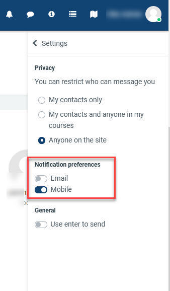 Along with a visible alert to new messages in the messaging menu, (if allowed by the administration) users can configure how they are notified of new messages from their message preferences page accessed from the user menu or the gear icon in the messages menu.
