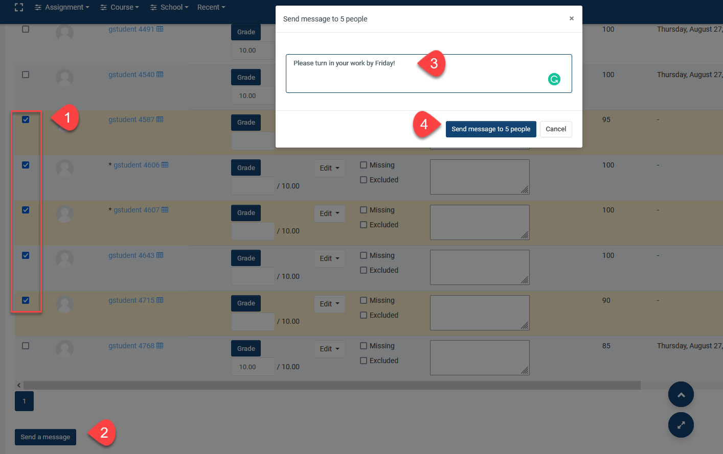 It is possible to send mass messages to your students while you are grading an assignment. On the assignment grading page, (1) select the students you want to send a message to, (2) click on "Send a message" button at the bottom of the list, (3) type your message in the text box on the pop-up window and (4) click "send message to ## people".