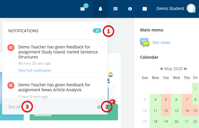 Clicking there displays any new notifications, along with the option to mark all as read (1 below), to go to the notifications preferences page (2) to change how notifications are received, and (3) to view all notifications.