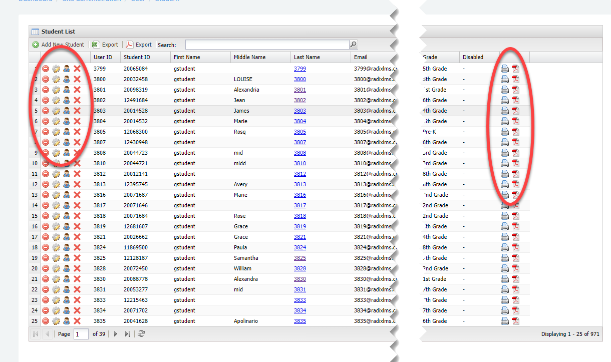 We will use the icons at the beginning and end of each row to withdraw, edit, add/edit contacts, delete, print grade history, or print student schedules.