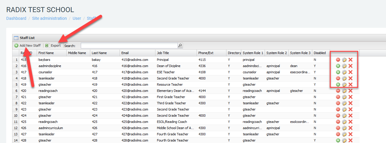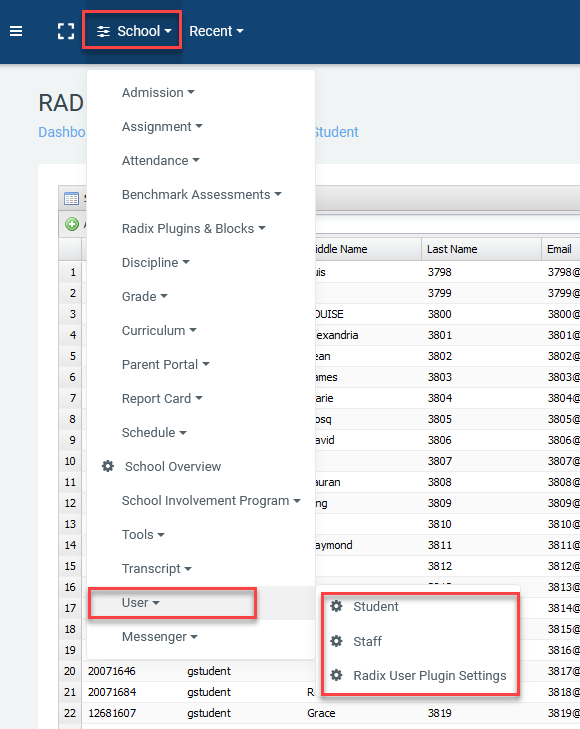 Radix LMS user management menus are located under School >> User where you can add/edit your students and staff information as well as their roles.