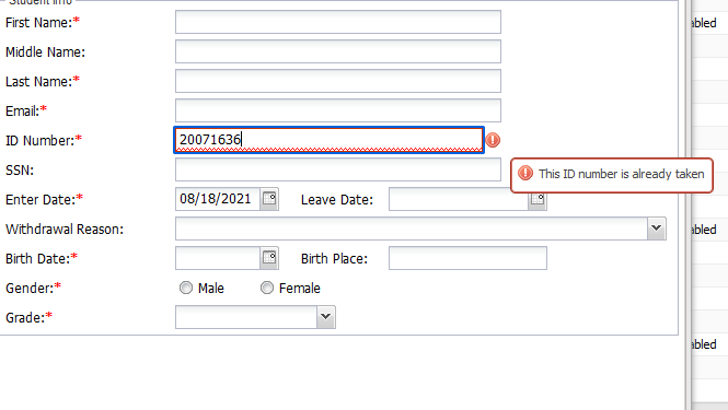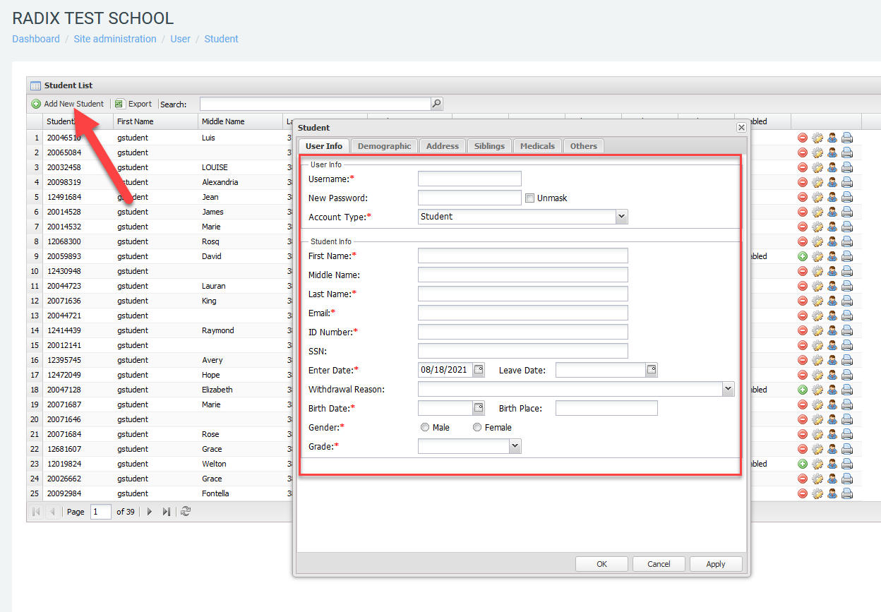 To add a student, click on the "Add new student" button at the top left corner of the report window and fill out the required fields on the pop-up window. The required fields are marked with a red asterisk and are only on the first tab. Information on the other tabs is optional. Please note that "Username", "Email", "ID Number" must be unique. The system will give you an error message if you try to add a duplicate value for these fields. Once done entering the information, click "ok" or "apply" to save the new student.
