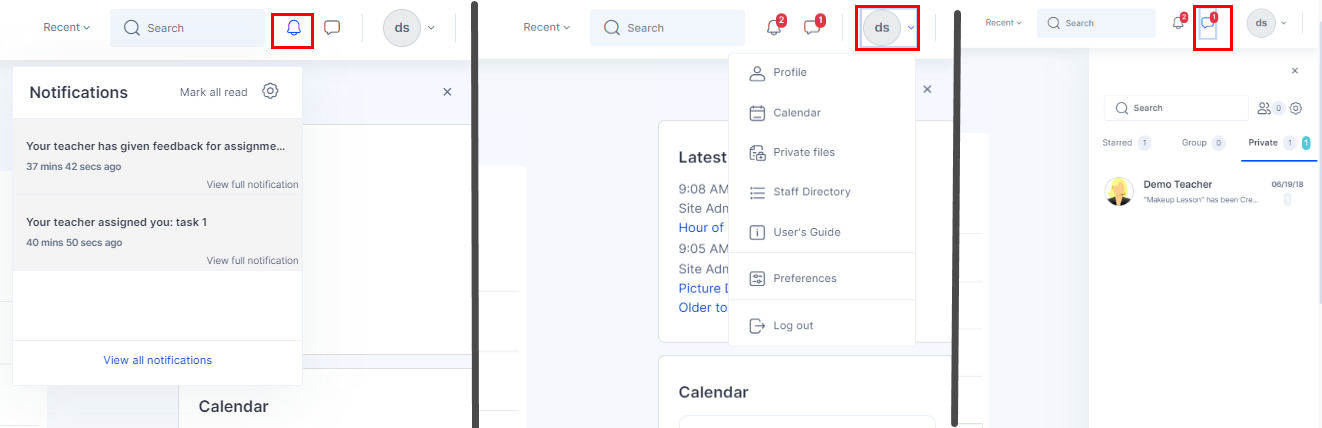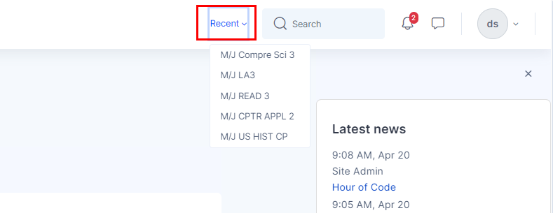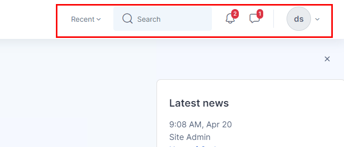 ![]() | On the right side of the Navbar, you will find your “Recent” menu for the recently accessed courses, site search to search your courses, notification and messaging icons and user menu. ![]() |