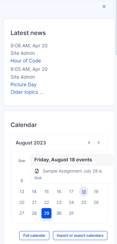![]() Block Drawer | The block drawer area is the place you can find the quick links, site news, calendar, upcoming events, and user files. There may be other blocks added in this area by your school administration. You can open your blocks drawer by clicking on the arrow shown below. ![]() |