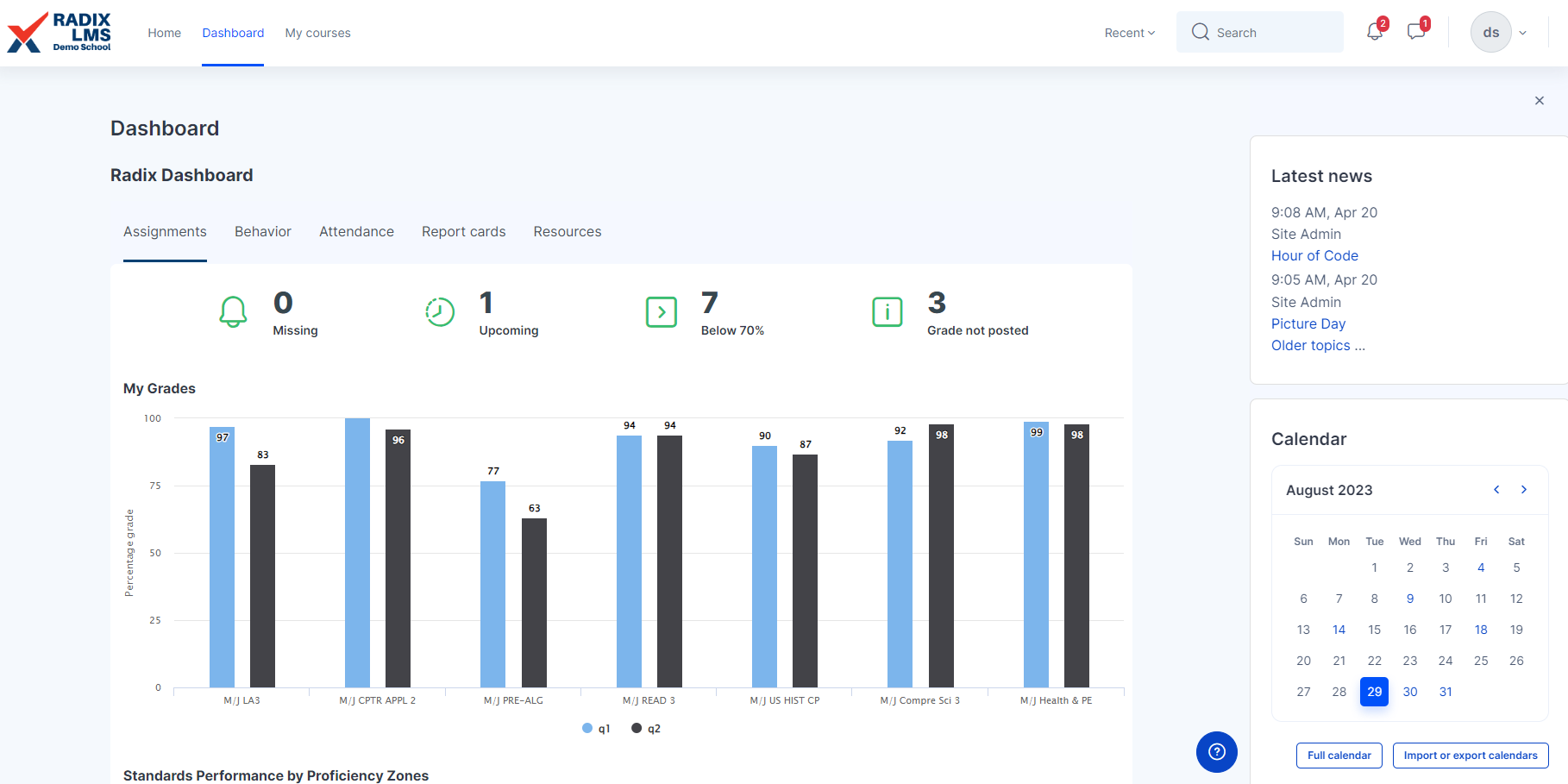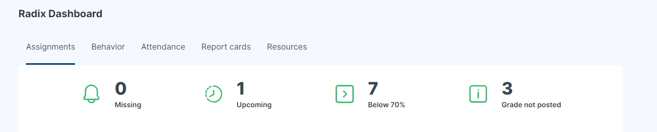 ![]() | The Radix Dashboard shows the assignment, behavior and attendance snapshots on top. Clicking on the numbers will take you to the detailed list of those categories. You can also access your report cards page from these tabs. ![]() The student's current grade average for the current and past terms can be found in my grades section in a graphical format. Clicking on the bars in the graph will take you to the grades summary page where you can check the detailed grades for each course. |