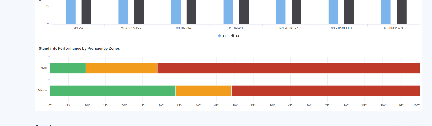 ![]() | If administered at your school, standards performance by proficiency zones will show the student's performance on the latest benchmark tests. Click on the bars to access the detailed report. |